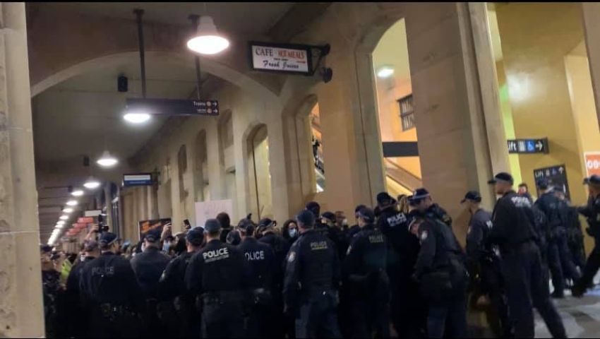 At about 7pm, a Central Station announcement informed the public that any “protesters” in the building “would be arrested if they did not leave: and informing commuters that Eddy Ave including all entries/exits and the light rail were completely blocked off due to a police operation and heavy police presence.”