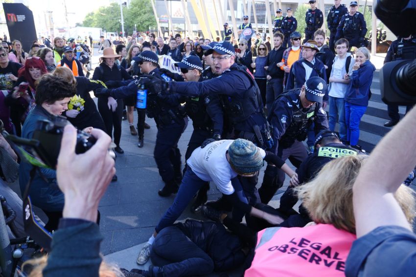 More recently, Victoria Police was described by activists as “setting a tone of violence” at last November’s otherwise peaceful protests outside the International Mining and Resources Conference in Melbourne. During these demonstrations against some of the largest fossil fuel corporations, police routinely assaulted, pepper-sprayed and horse-rammed protesters who were calling for real action on the climate.