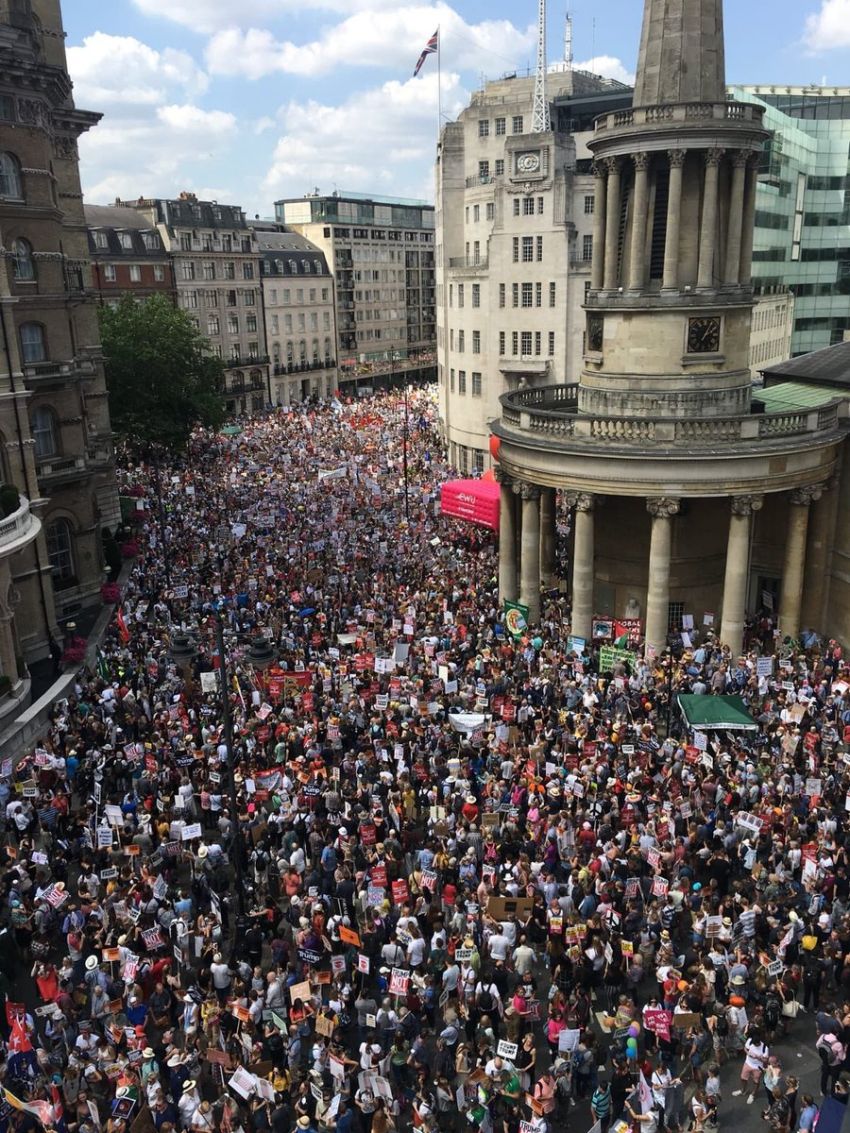 While May and Trump held hands then delivered a press conference at Chequers, tens of thousands of demonstrators poured into the streets for the main event—a 2pm march to Trafalgar Square in Central London, where anti-Trump Britons plan to host a rally Friday evening, despite accusations that British officials aimed to curtail protests.