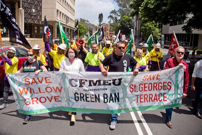 The Construction, Forestry, Maritime, Mining and Energy Union has placed a green ban on the site, and protesters pledged their support to stop Willow Grove from being moved or destroyed — including taking part in civil disobedience actions.