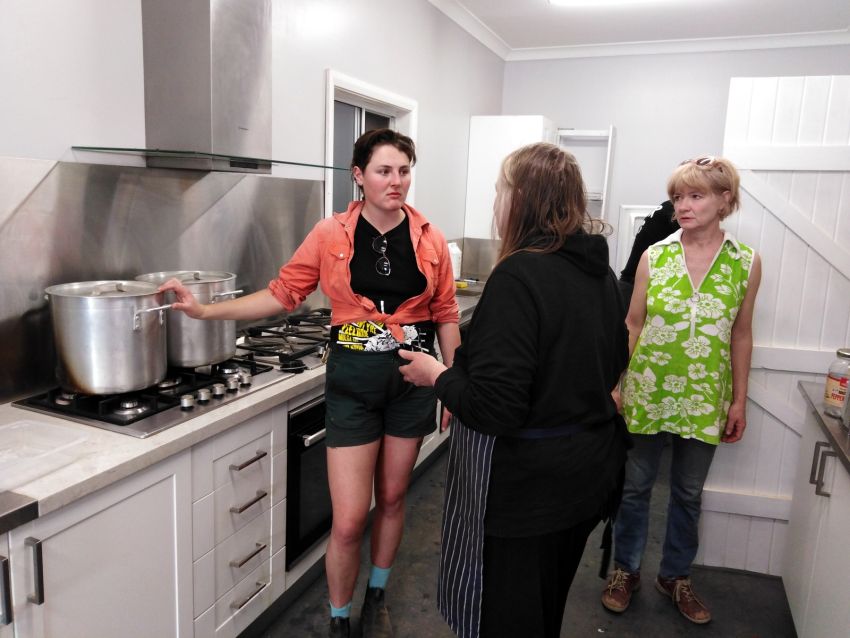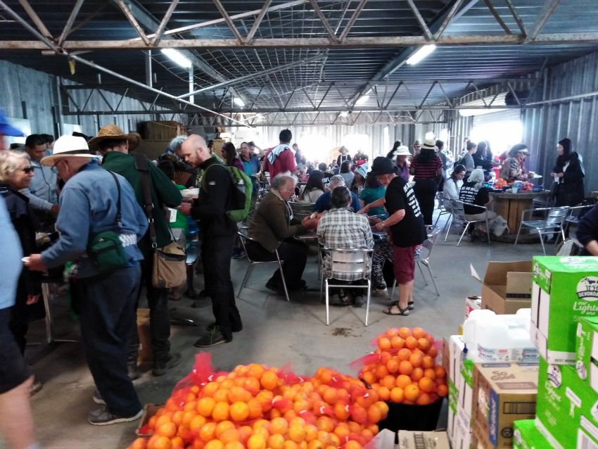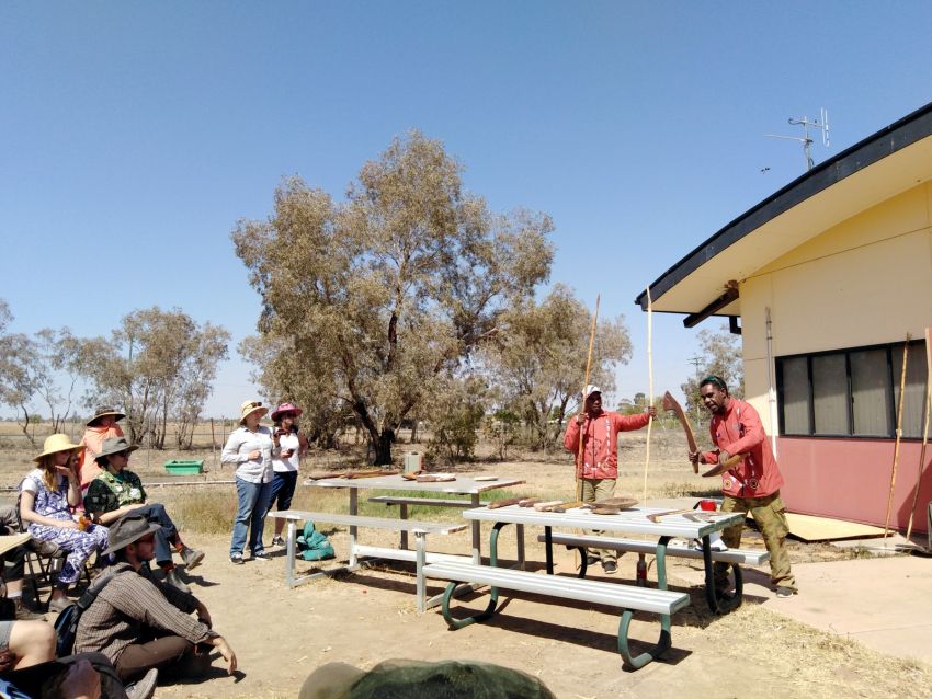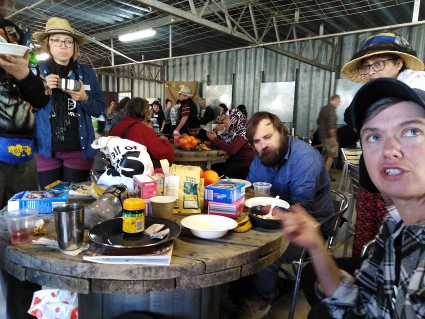 We're interrupted as an organiser makes an announcement about donating our food to local food banks in Bourke and Wilcannia.