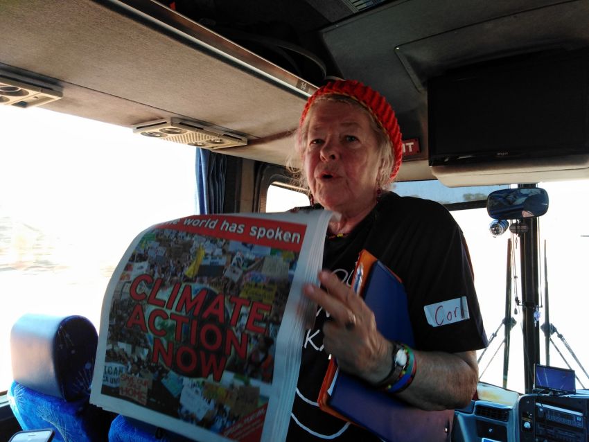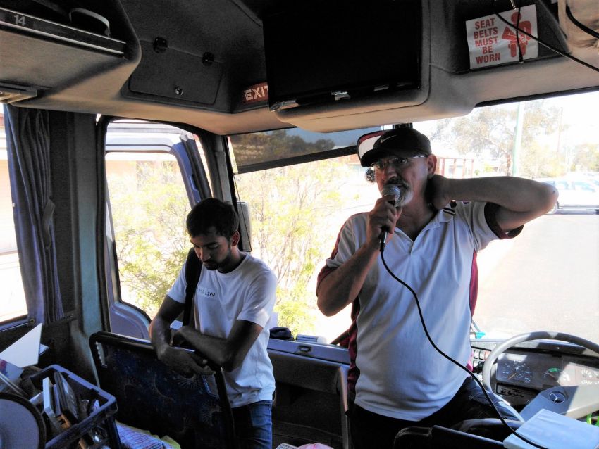 Rachel Evans announces that it's bus one versus bus two in a competition to see who can come up with the best Water For Rivers chant by the time we get to Wilcannia.