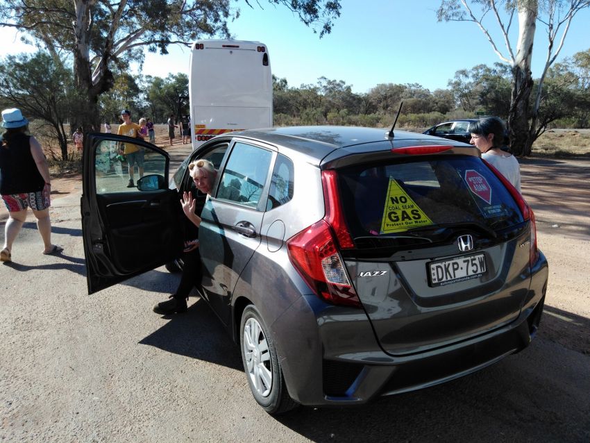 The whole convoy pulls into the red dust of a rest stop on the Barrier Highway to Wilcannia. After peeing in the bush, stretching under the trees, reading all the traveller graffiti and applying ochre to our faces, we unfurl our banners and start practising chanting for the media conference.