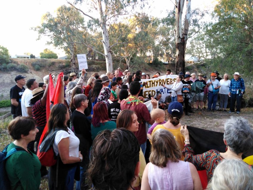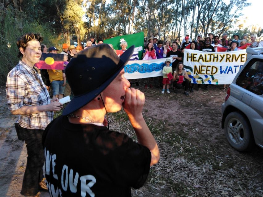 Organiser Rachel Evans leads the throng, with chants against big irrigators: "Water for the rivers! Yes we can! No to Chris Corrigan! No not him! No to Peter Harris! Not him either! Water for the rivers! Yes we can!"