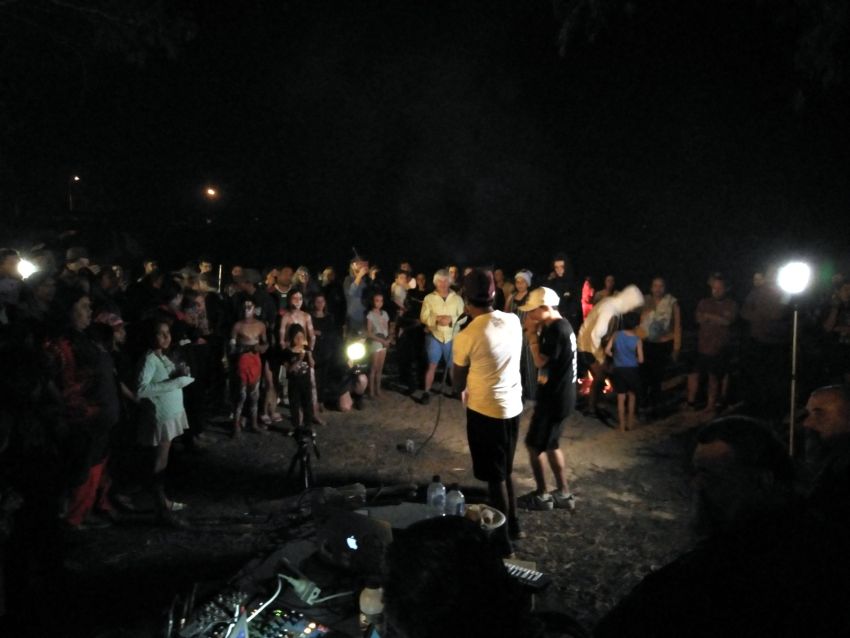 As we walk through the dark into the Corroboree site's entrance, at the top of a natural amphitheatre, local Aboriginal people welcome us with waves and smiles.