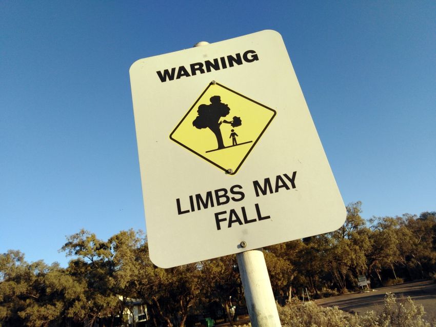 As we pull into Victory Park caravan park in Wilcannia, there's an ominous sign warning about the falling branches of gum trees, otherwise known as widow makers.