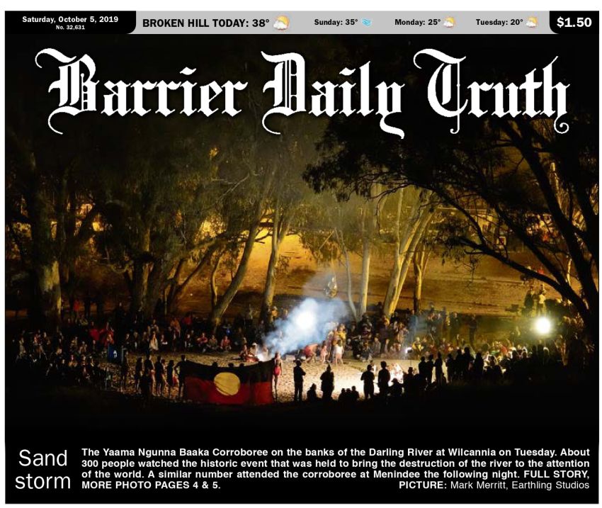 Wilcannia is suffering from power cuts and my mobile phone's camera is suffering in the poor light. Activist Mark Merritt takes a far better photo of the Corroboree site that makes the front cover of local paper, the Barrier Daily Truth (above). The ABC films some great footage of the dancers resplendent in ochre.