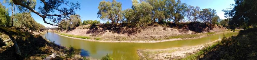 On my phone, I take a panorama shot of the stretch of the river that runs by the campsite. The Corroboree site is just on the other side of the bridge you can see, where the river becomes drier and choked with weeds.