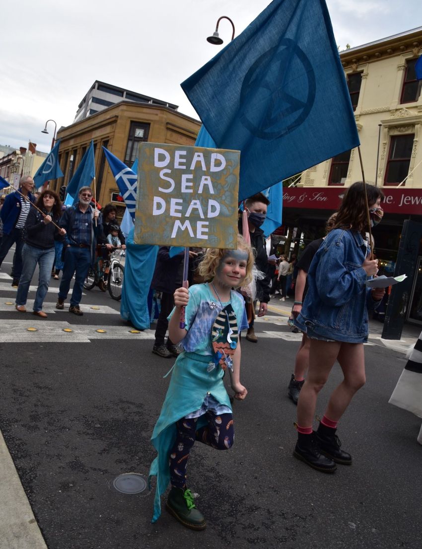 In Hobart on October 3, people marched, sang, drummed, chanted, danced and then “died” on intersections in the city’s streets with many young people taking part in the “dead sea” march.
