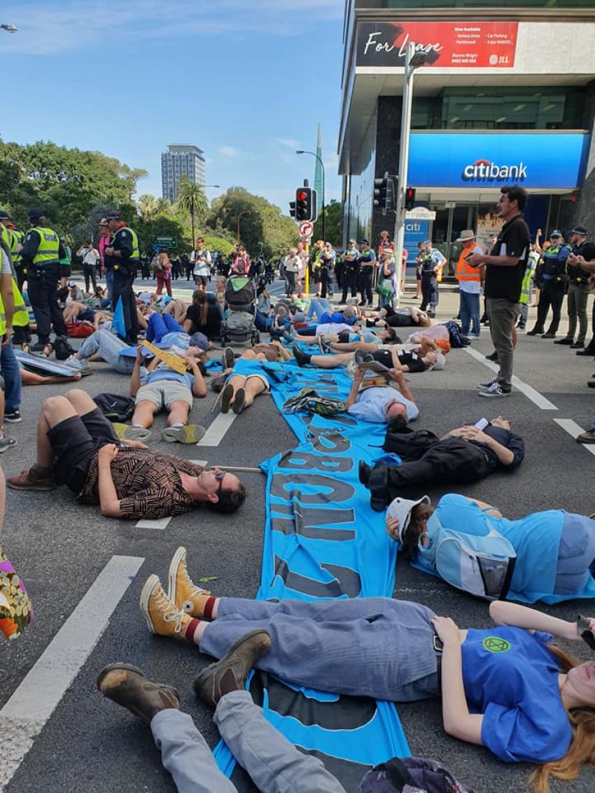 A die-in was held on the busy St George’s Terrace intersection, outside Stirling Gardens, to demand urgent climate action.