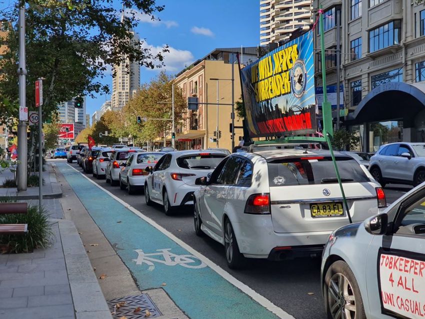 The cars were emblazoned with posters and banners including: “Stop job cuts, climate jobs now”; “Immediate expansion of JobKeeper”; “Freeze rents, mortgages, evictions”; and “International solidarity for all”.
