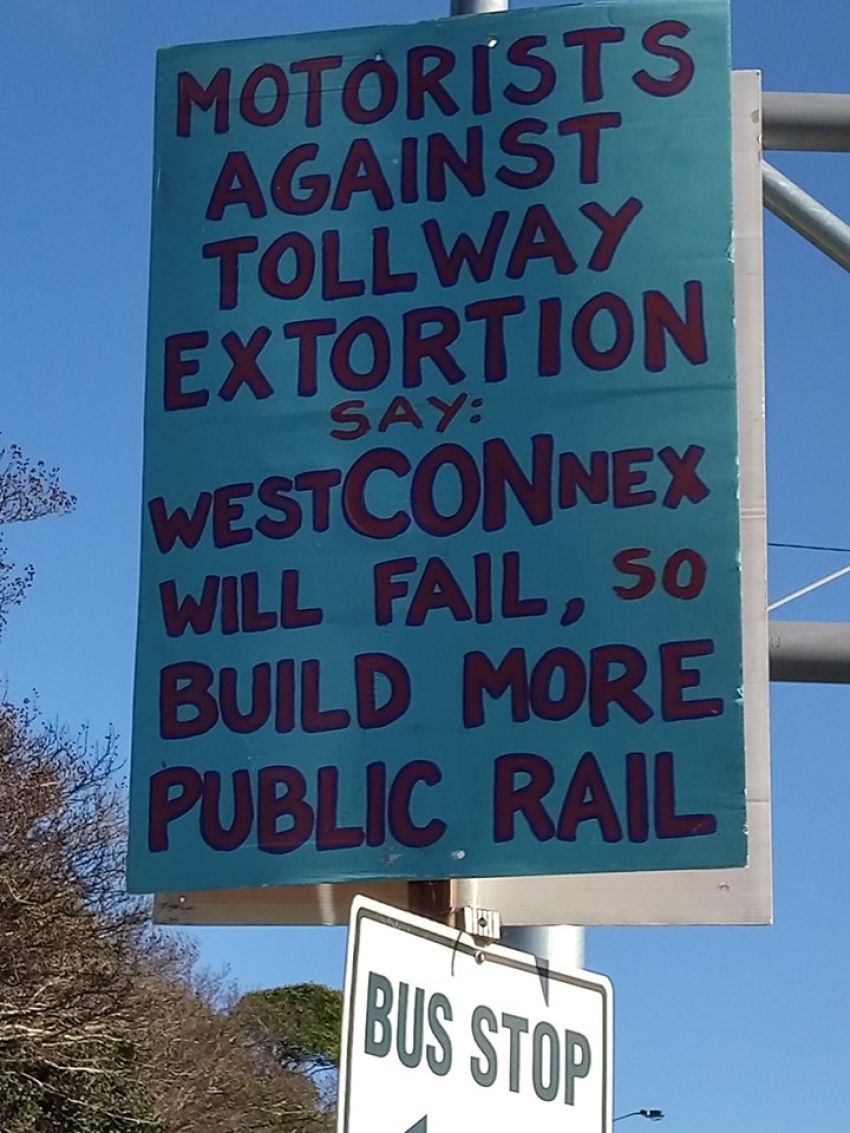 At Ashfield Park, adjacent to a nearby tunnel entrance, protesters displayed banners reading “Sydney needs more trains and buses, not tollroads” and “Crowded trains, traffic jams and tolls: Who wins? Who loses?”