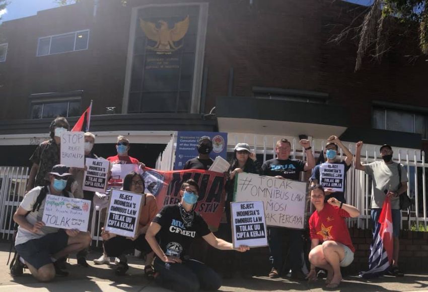 Indonesian human rights activist Veronica Koman told a solidarity gathering outside the Indonesian consulate in Maroubra on October 9 that a new labour law was a “crime against the people of Indonesia”.