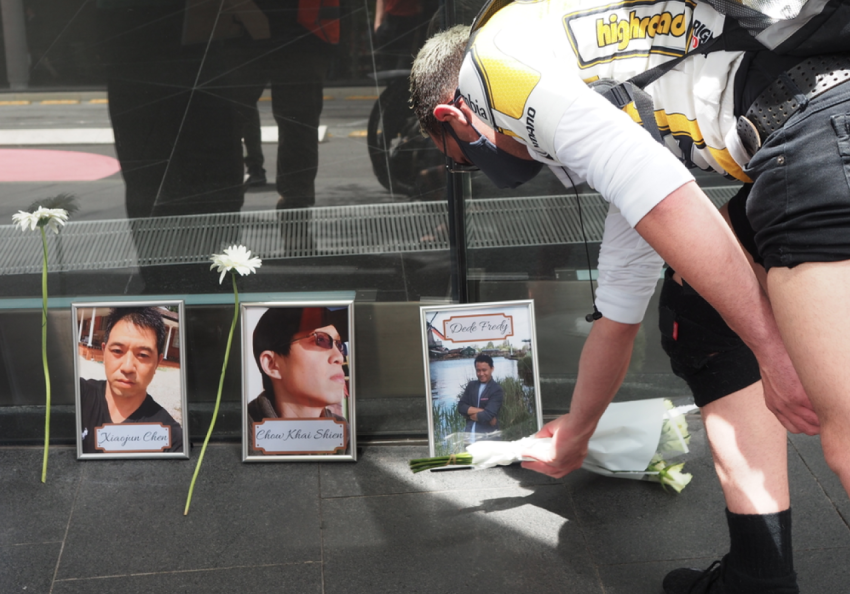 A minute’s silence was held for the five delivery workers who died. Flowers were placed next to photos of the killed riders: Xiaojun Chen, Dede Fredy, Chow Khai Shien, Bijoy Paul and a fifth worker who is yet to be named.