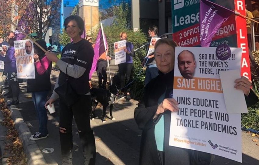 A protest outside Josh Frydenberg's Melbourne office in May. Photo: NTEU/Facebook