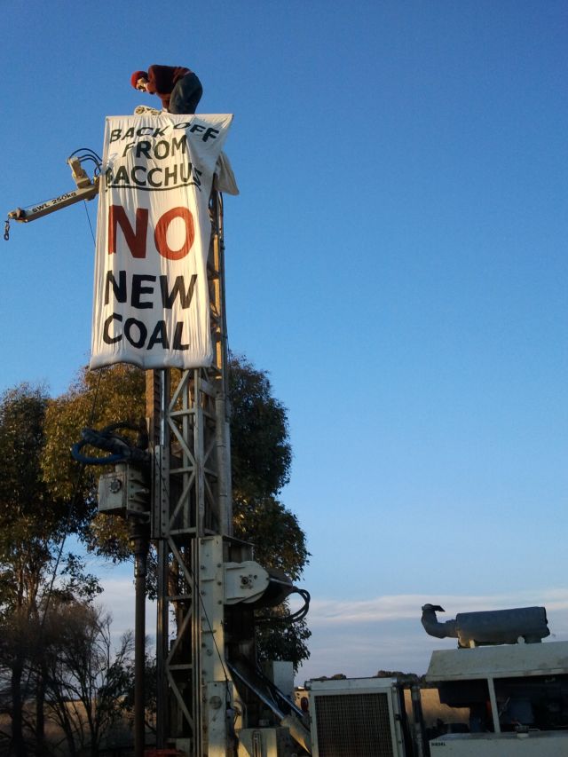 On September 19, FoE activist Shaun Murray locked himself to a drilling rig that was part of Mantle Mining’s exploration activities at Bacchus Marsh for five hours, halting work.