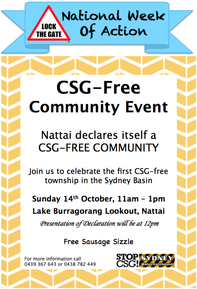 The residents of Nattai, a township that overlooks Lake Burragorang — the source of fresh drinking water for residents of the city of Sydney and the lower Blue Mountains — have overwhelmingly supported a declaration that Nattai and Sydney Water Catchment be CSG Mining Free.