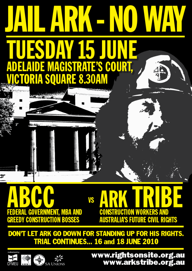 Ark Tribe is an Adelaide construction worker facing up to six months’ jail for refusing to be interrogated by the Australian Building and Construction Commission, the secret police set up by the former John Howard federal government to smash the strength of the building unions.