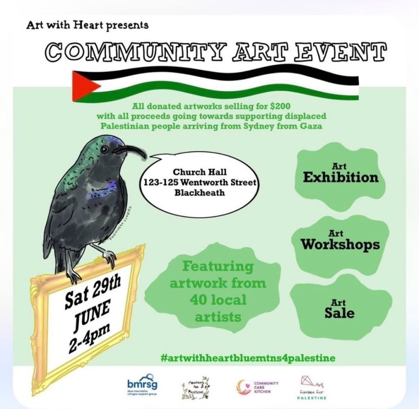 Art with heart Blue Mtns 4 Palestine is a community art exhibition, art sale and art workshops, co-woven by over 40 artists from unceded Dharug and Gundungurra land and beyond, to raise funds for Community Care Kitchen and Palestinian Christians in Australia. Both organisations are working tirelessly to support displaced Palestinians from Gaza who have arrived in Western Sydney. Palestinian refugees are not yet eligible for humanitarian visas. They are here on visitor visas and therefore dependent on community-led support.