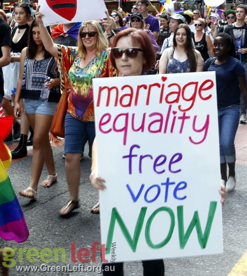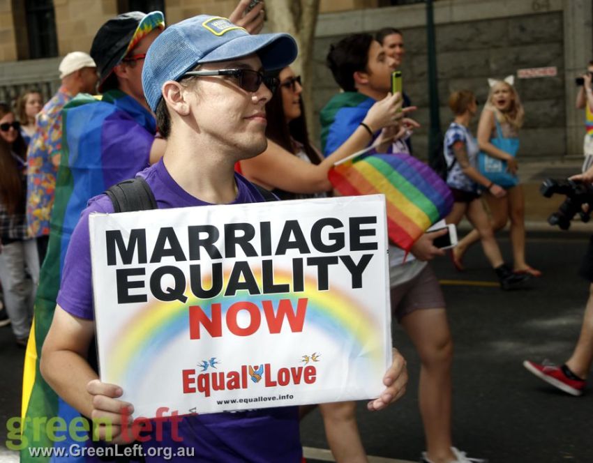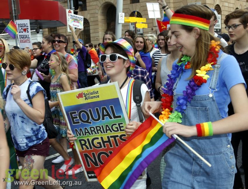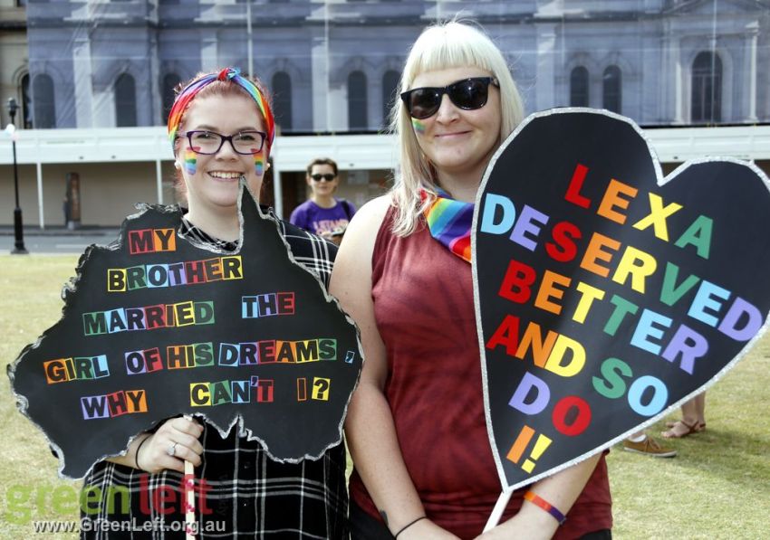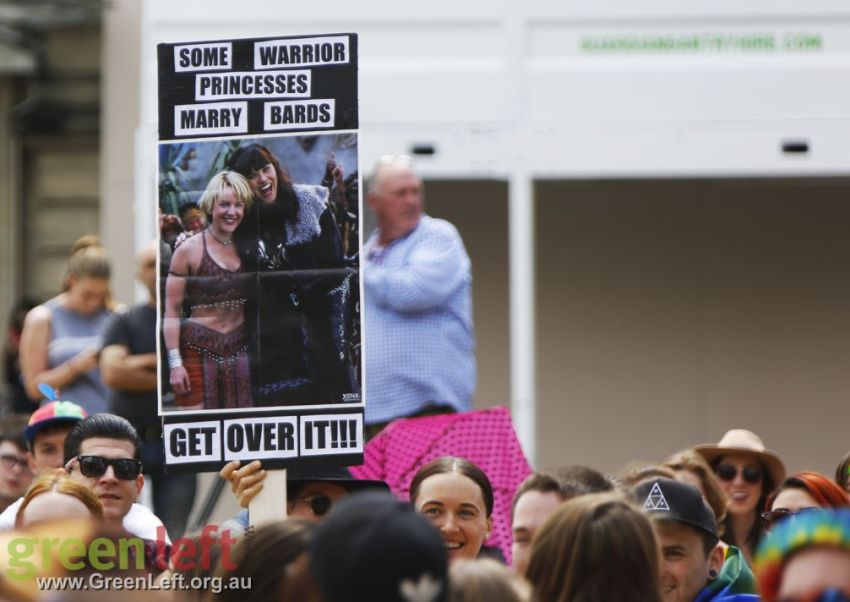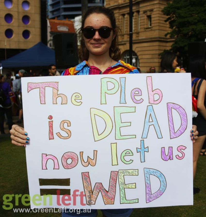 "The Pleb is dead, now let us wed" read one placard at Brisbane's October 15 rally for marriage equality.