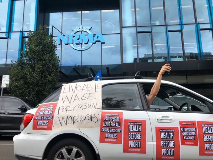The May 1 Movement and the Maritime Union of Australia (MUA) Sydney Branch organised a car cavalcade to converge on the NRMA office in Olympic Park on March 27.