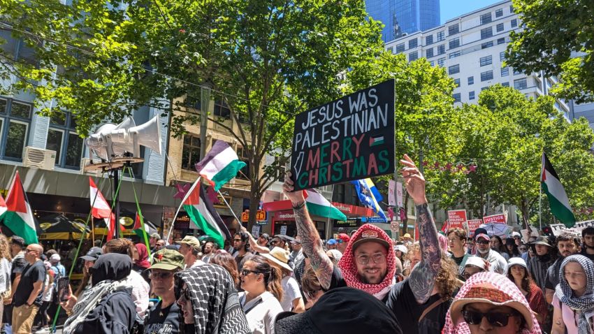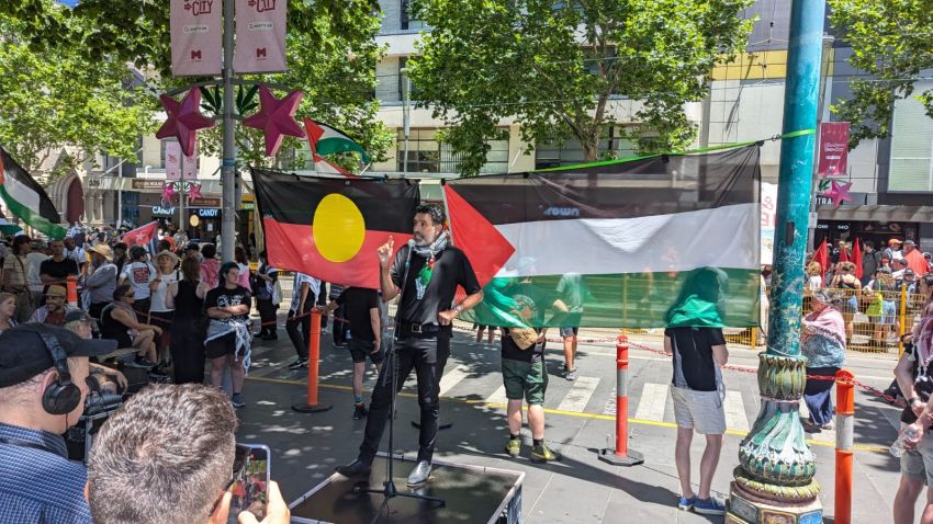 The protest took place under the additional threat of a Victoria Police imposed “designated zone”, which gives police powers to stop, search and move people on. There was also a small Zionist rally at Parliament House earlier that day.