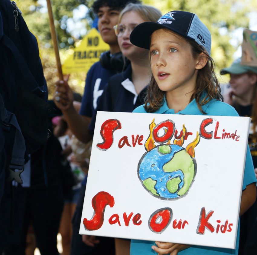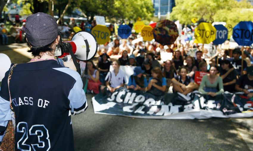 School strikers on the platform denounced the government's greenwashing and said that "we've been let down by the institutions that are meant to protect us".
