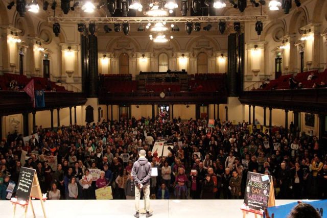 More than 1500 people crowded into Sydney's ornate Town Hall as an east coast low brought rain tumbling down, to rally for refugees.