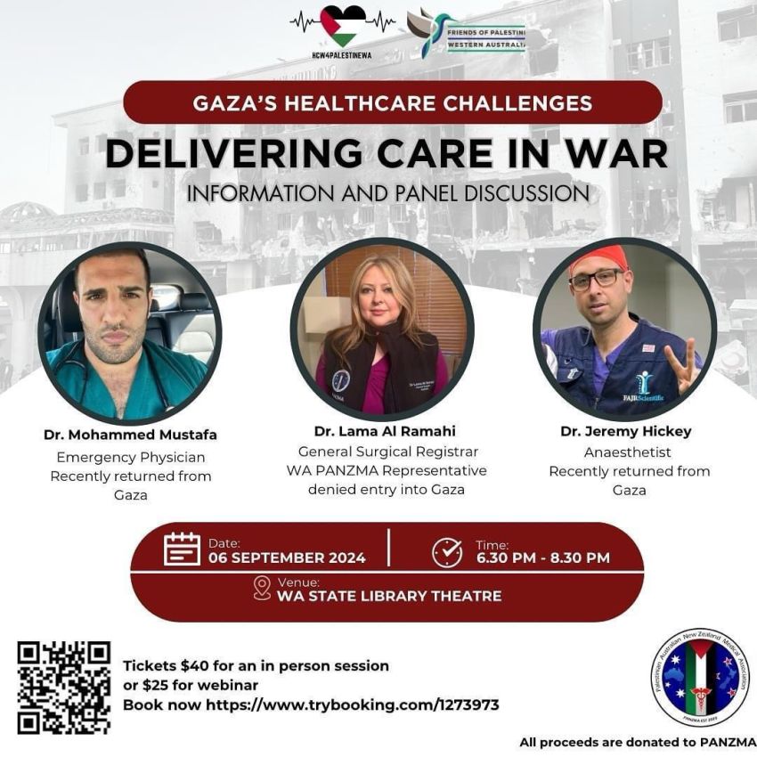 Healthcare Workers for Palestine WA , in collaboration with the Palestinian Australian New Zealand Medical Association (PANZMA) and Friends of Palestine WA (FOPWA), invite you to a panel discussion bringing together doctors who have recently returned from Gaza, to share their first-hand experience of the ongoing humanitarian catastrophe.