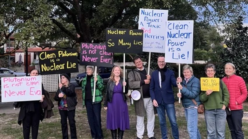 Anti-nuclear activists protested outside a fundraiser at the Double Bay bowls club on July 11, hosted by Nationals MPs Keith Pitt and David Gillespie, advocates of the Coalition’s nuclear power plan.