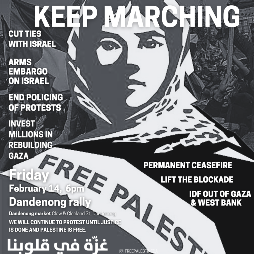 Come along to the next Free Palestine Dandenong rally, to show solidarity for Palestine in the South East!