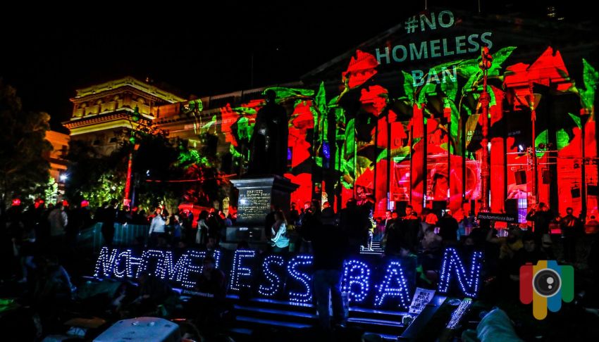 The protest, which lasted all night, was held during Melbourne’s White Night, which typically attracts massive crowds in the city. It involved a number of protesters converging on the steps of the State Library with placards and banners reading “Homelessness is not a Crime”, “No Homeless Ban” and “Resign Robert Doyle”.