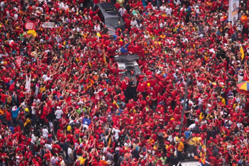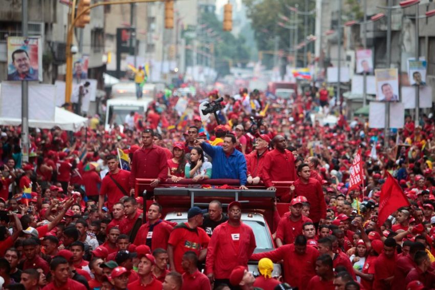 "The rain came down at one stage and we all got soaked. Chavez stepped out from under cover and spoke to the massive crowd in the rain, which he welcomed as a blessing for the election on Sunday."
