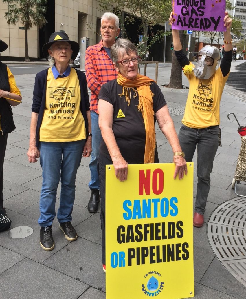 Sydney Knitting Nannas and Friends gathered outside Santos’ Sydney office to protest its Narrabri Gas Project on April 6, as the company held its annual general meeting in Tarndanya/Adelaide.