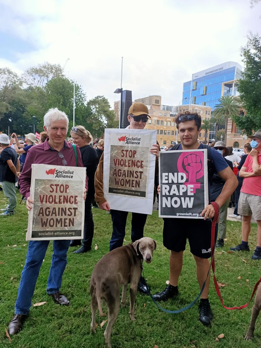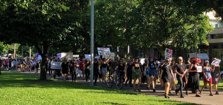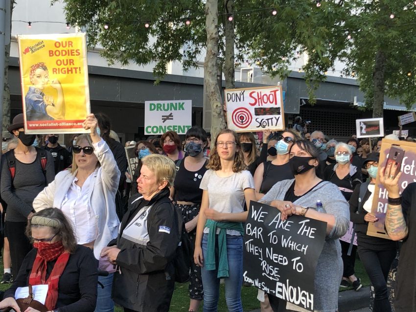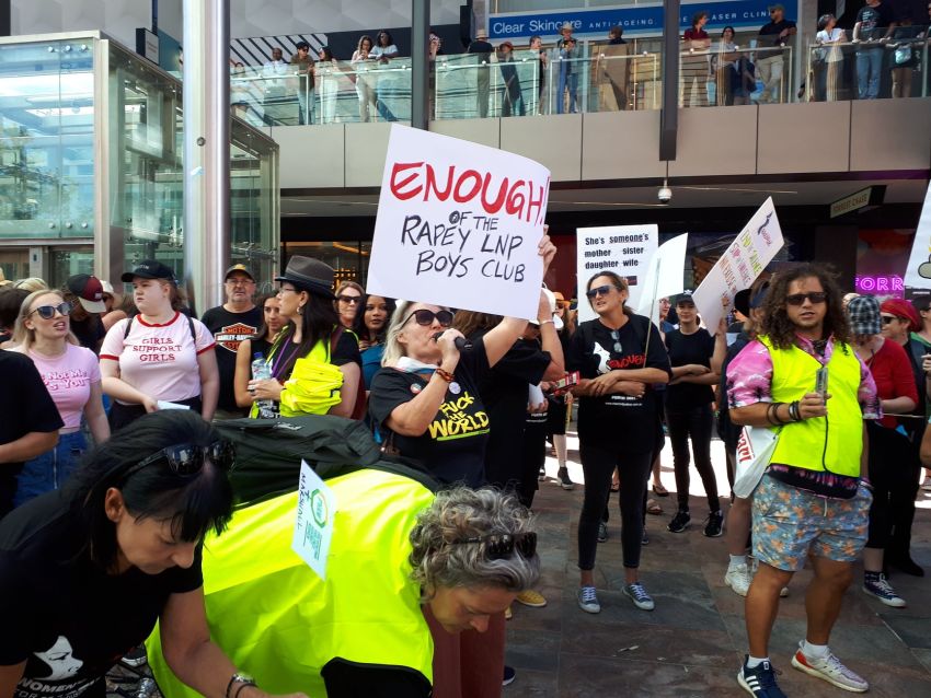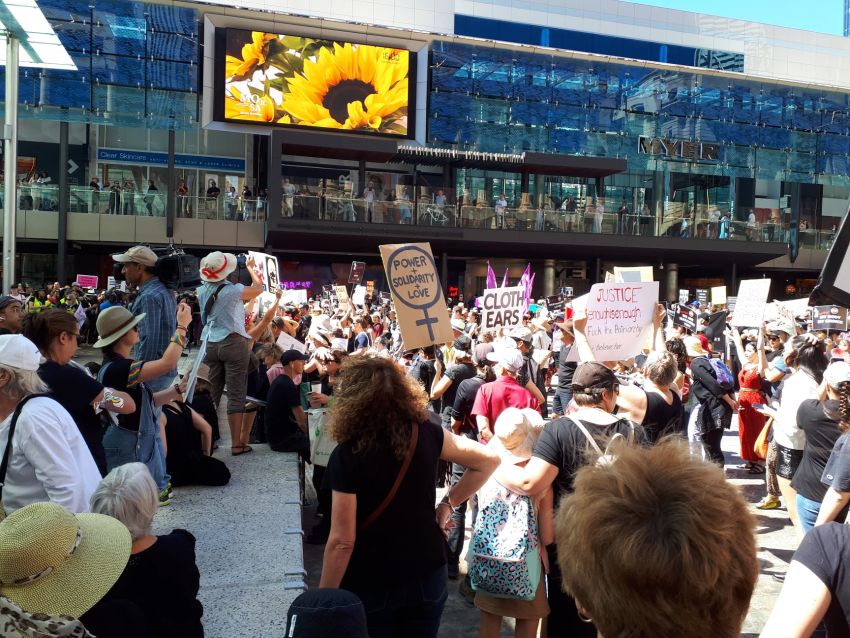 An open mike was a safe space for more than a dozen women to recount deeply personal experiences of discrimination, rape and other forms of sexual violence, Steve O'Brien reports. The protest of more than 2000 people in Newcastle's Civic Park was chaired by Sara Motta, who introduced: Liann Taffe, a Warlga Ngurra woman and children's refuge caseworker; Helen Cummings, a domestic violence survivor and Lynda-June Coe who said there was a need to "burn this system to the ground".