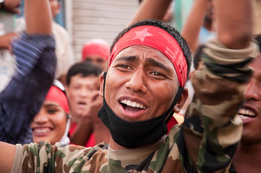 On May 1, Nepal was entirely shut down by huge demonstrations called by the Unified Communist Party of Nepal-Maoist (UCPN-M) to call for the resignation of the unpopular government. In Kathmandu, at least 500,000 marched — the streets a sea of red flags.