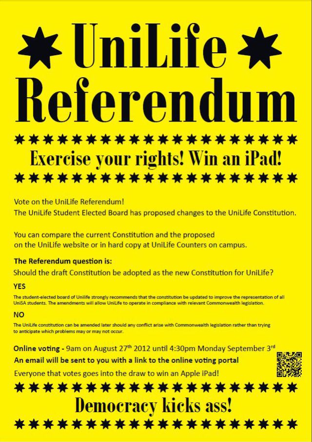 “During the referendum, the returning officer decided this clause did not apply to referenda and left ‘Yes’ at the top of the ballot.” Students who voted went in the draw to win an Apple iPad.