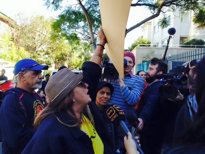 Aboriginal leaders including Ken Canning, Jenny Munro and others from the Redfern Tent Embassy, Michael Anderson from the Sovereign Union, Albert Harnett, Patricia Corowa and other elders protested outside with supporters.