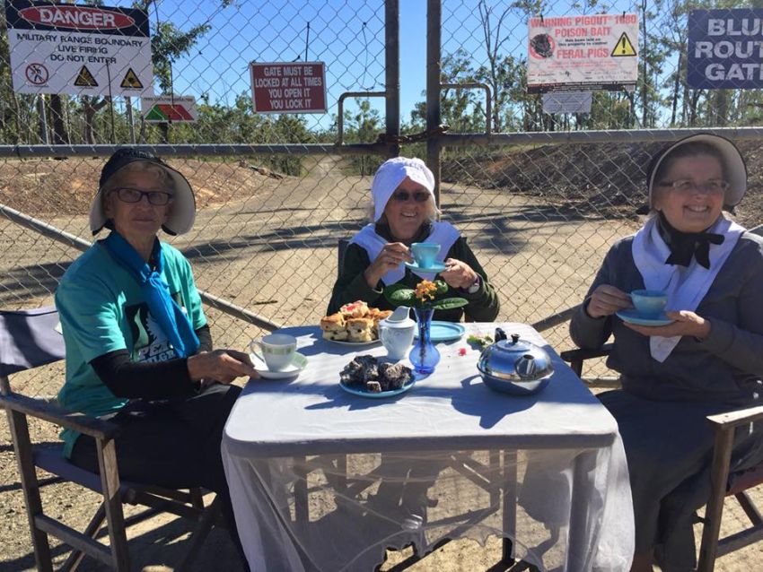As part of Peace Convergence 2015, three “Quaker Grannies for Peace” set up a tea table on July 13, blocking the access road to Queensland's Samuel Hill military base, which is being used for the Talisman Sabre military exercises.