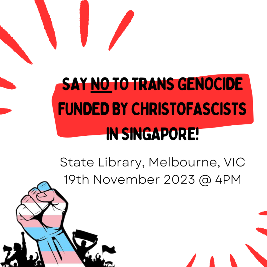 Let's stand up for trans folks in Singappore and all over the global and against Christoffascism. Join us outside the State Library on Sunday, 19th November at 4pm.
