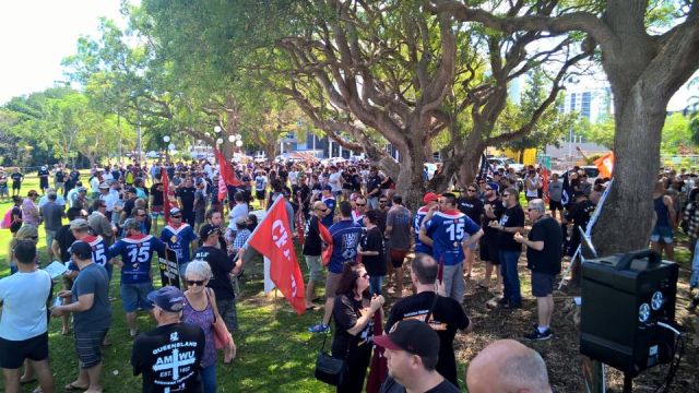 More than 800 workers gathered in Bicentennial Park on August 23 to protest against the China-Australia Free Trade Agreement in a rally organised by the Electrical Trades Union (ETU).