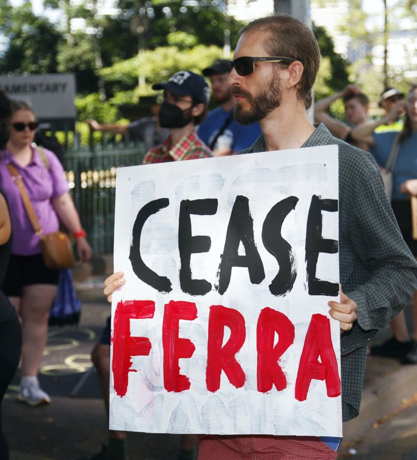 Protesters blocked the road next to the Queensland parliament on March 7 as part of the campaign to #ShutDownFerra.