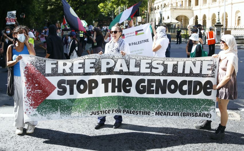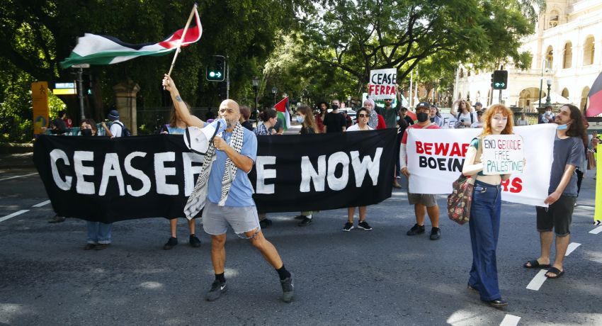 Greens leader Adam Bandt joined the protest and spoke against providing military support to Israel.