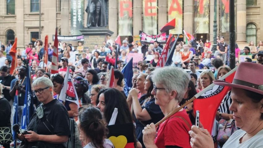 When Michelle O’Neill, president of the Australian Council of Trade Unions (ACTU) spoke, a few women chanted “CFMEU” to demonstrate their displeasure at the ACTU’s complicity in attacks against that union.