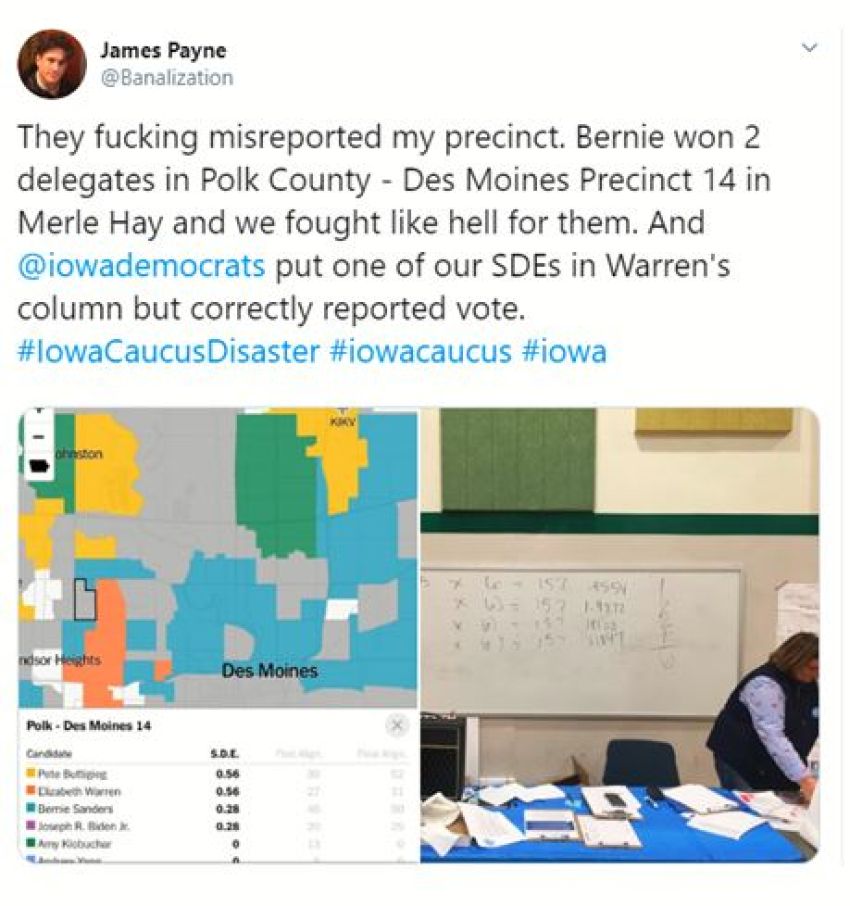 - Evidence emerged of result-tampering by Shadow Inc and the IDP — in one case Sanders’ votes were simply passed on to Deval Patrick, a non-entity contender.