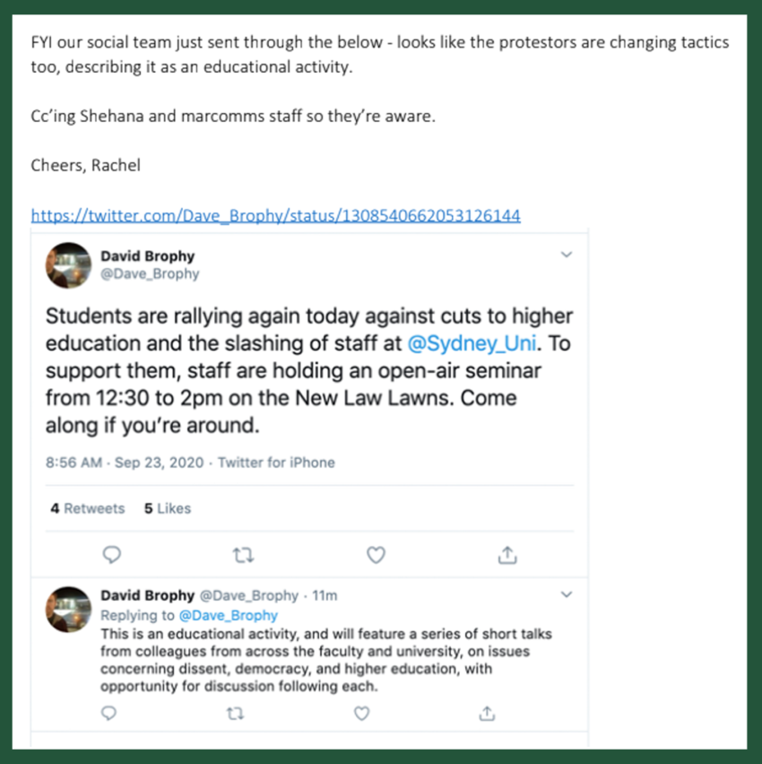 In particular, tweets in support of student activities by senior lecturer in Modern Chinese History David Brophy and law professor Simon Rice were monitored and shared with university operations staff.