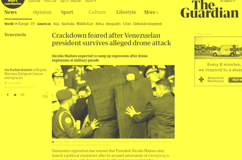 Remarkably, it is the Venezuelan opposition that takes precedence in an article about an assassination attempt on Maduro. This would be akin to a report on the 9/11 terrorist attacks opening with “Al-Qaeda warns of increased US involvement in the Middle East”.