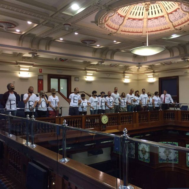 Pro-democracy activists held an impressive follow up action on March 15, disrupting state parliament itself. Seventeen people stood in the public gallery with the words “Protect Protest WA” spelled across their t-shirts. They stood with their mouths closed before removing the symbolic gags and singing a classic protest song calling for the right to protest to be respected.
