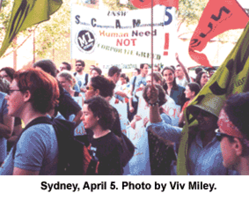 The gig also launched the Sydney M1 CD, a compilation of songs from local bands ranging in styles from folk to rock to electronica. The CD, which is quickly becoming a collector's item, is available for $15 from all Resistance Centres in Sydney (details on page 2). All proceeds go to funding the shutdown of corporate Sydney on May 1.