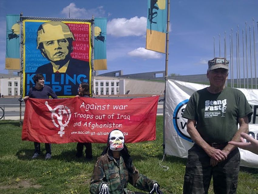 Meanwhile, outside on the lawns, Peacebus.com and Stand Fast organiser Graeme Dunstan, and veteran Gerry Binder had spent the morning setting up striking banners with the message: “(Obama) Killing Hope” and “Troops out of Afghanistan/No more U.S. wars!” .